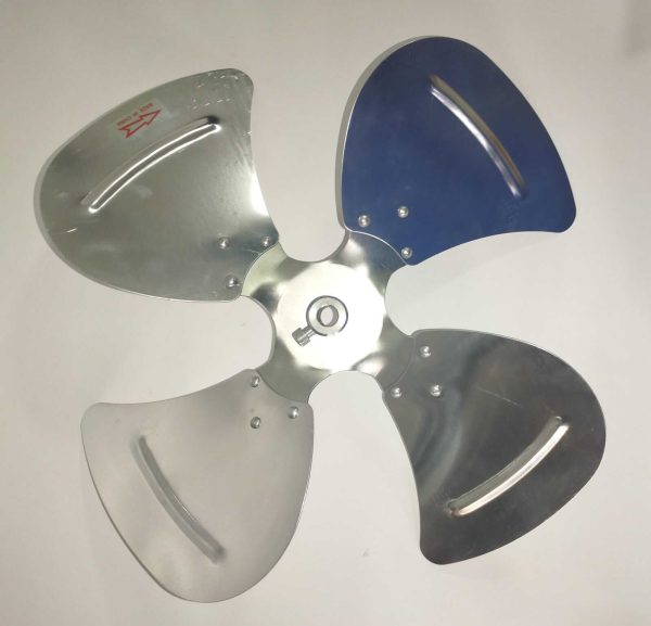 Hélice de aluminio diseñada para operar en motor eléctrico asincrónico con dirección del giro del reloj.