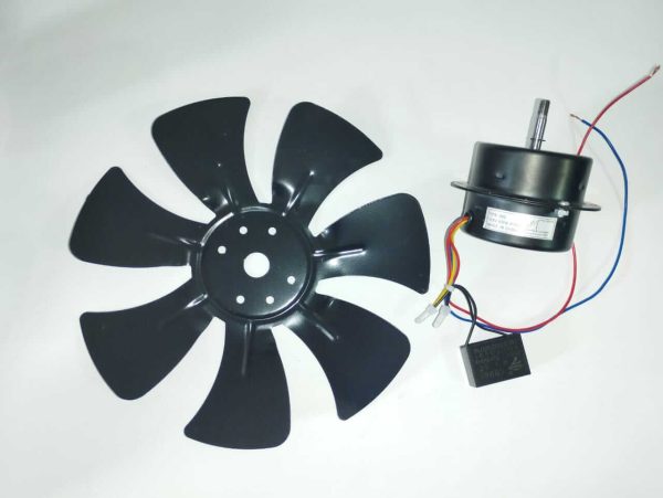 Motor eléctrico (Modelo: YPS-080 ), Opera: 120V, 60Hz Y 80W; Posee un capacitor 7µF ± 5% (250V, 50/60Hz, 40/70/21) y una hélice metálica de 300mm color negro.